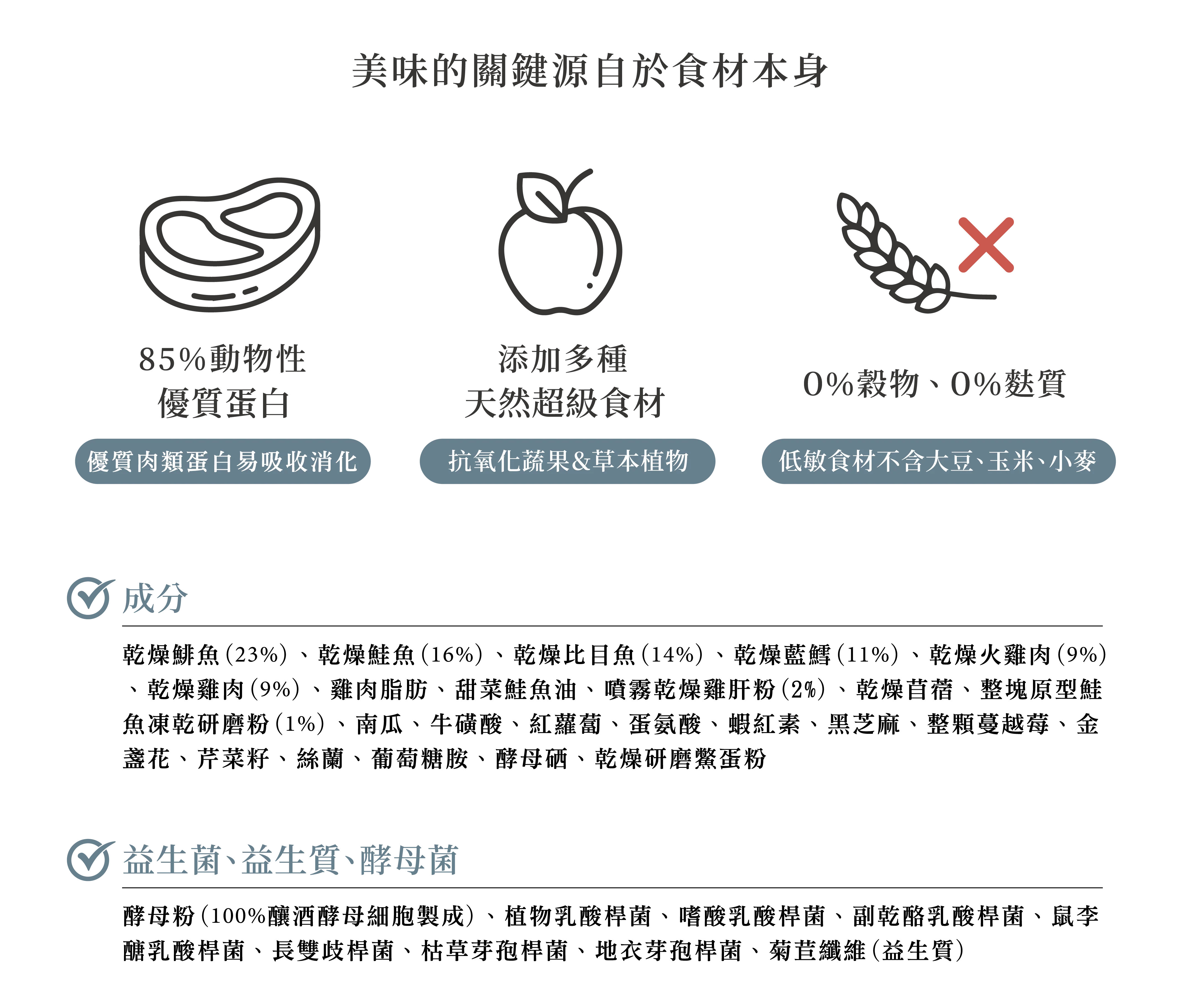 85%動物性優質蛋白 + 15%蔬果草本,高含肉量,營養易吸收消化