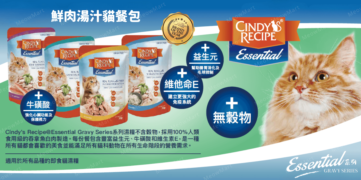 Cindy's Recipe® Essential 新鮮吞拿魚+雞肉 (肉汁) 貓餐包 70g吞拿魚片、水、雞肉片、改性木薯澱粉、吞拿魚萃取物、增稠劑、吞拿魚油、FOS(低聚果糖)、維生素 E、牛磺酸
