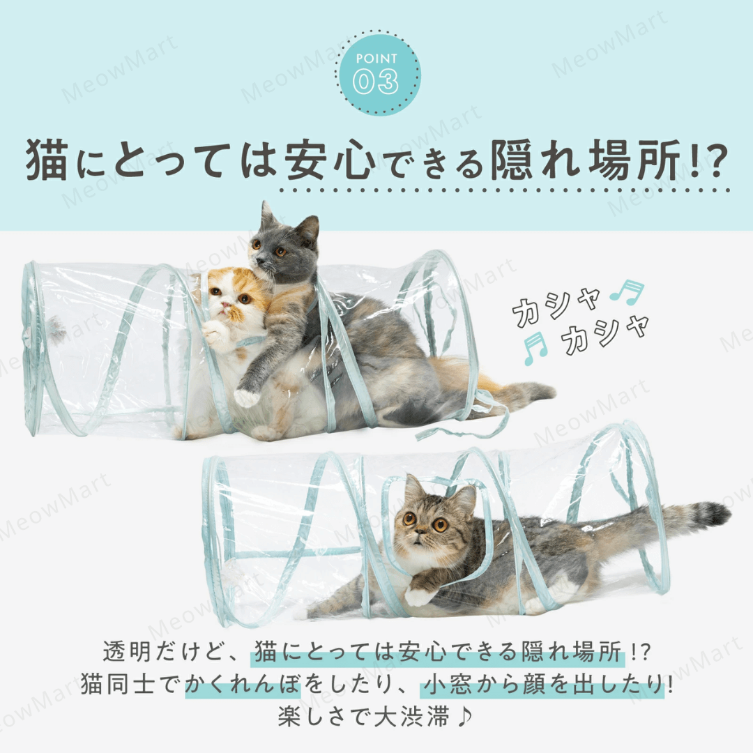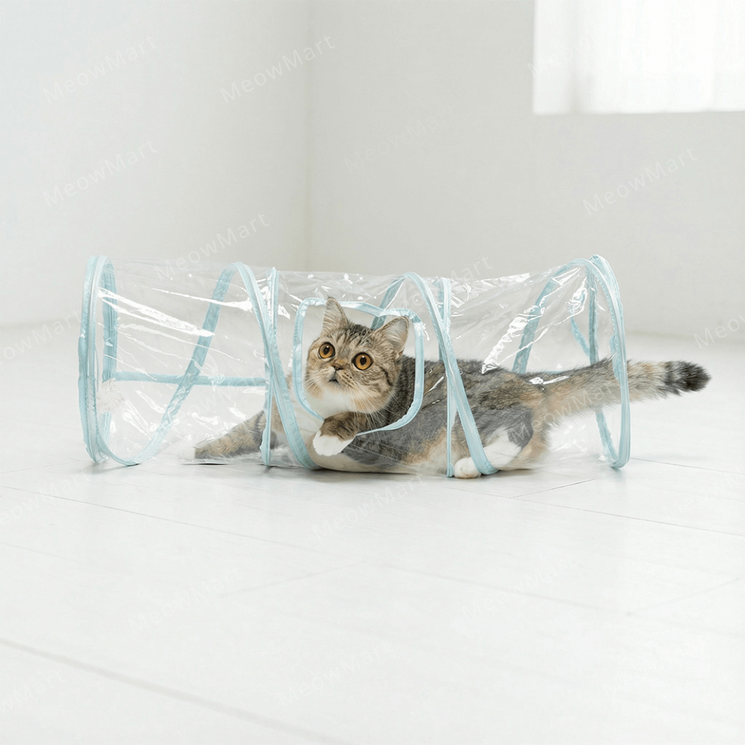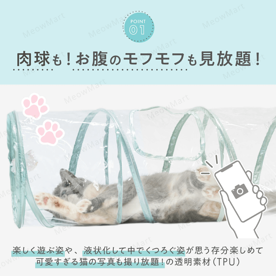 透明設計:讓貓奴們欣賞主子在隧道裡快樂玩耍、放鬆休息的模樣,還能看到它們的粉嫩肉球和毛茸茸的小肚肚!盡情拍照!
