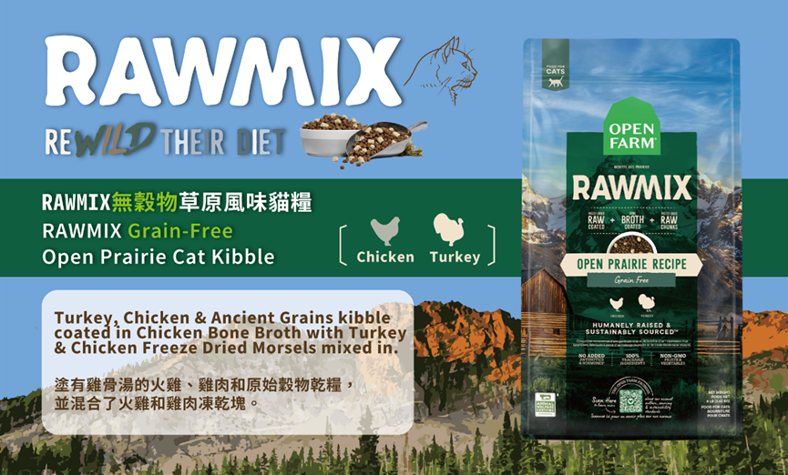 - 塗有雞骨湯的火雞和雞肉無穀乾糧,配有雞肉和火雞肉的凍乾生肉塊