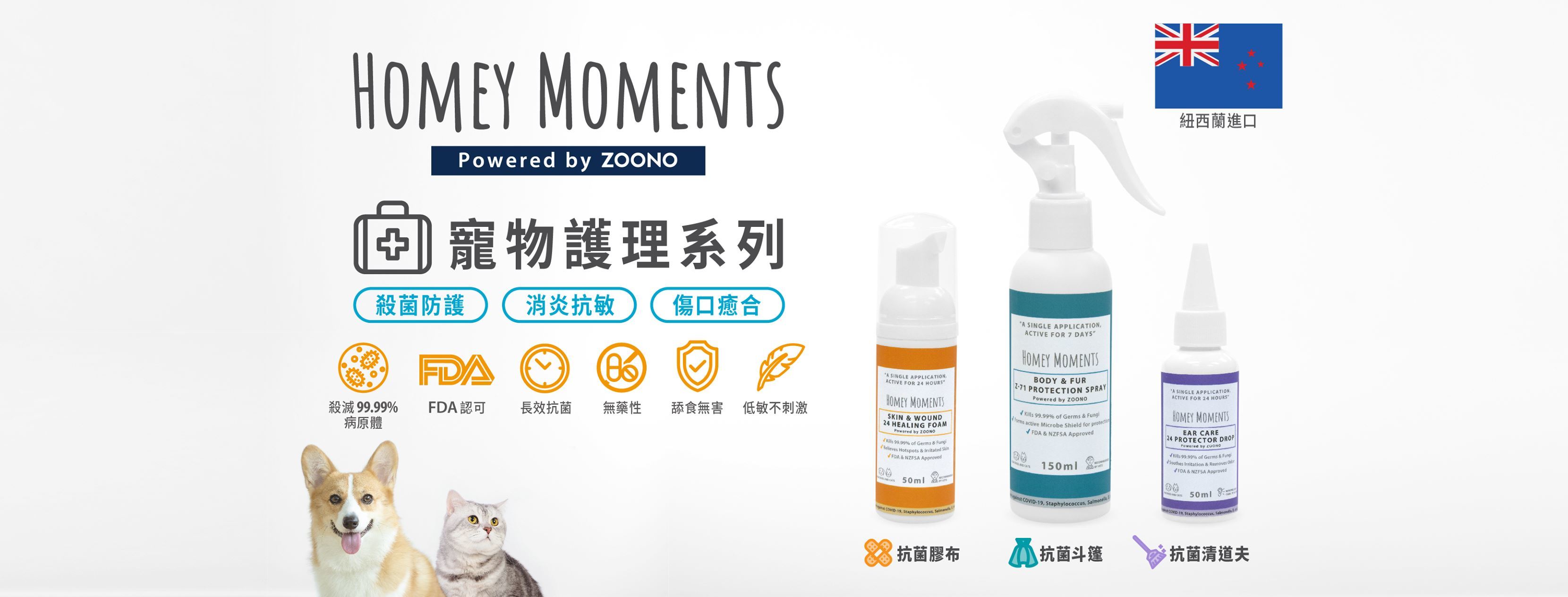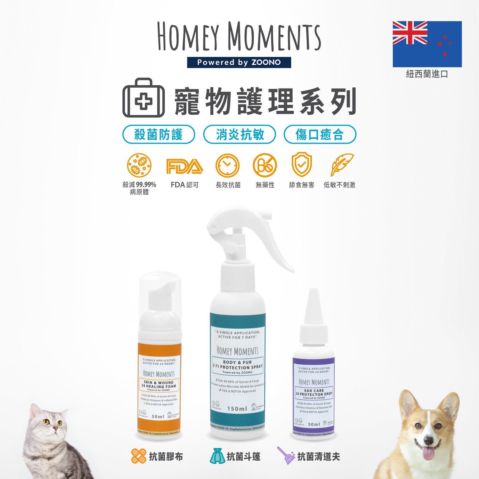 有別於坊間只能提供短暫的消毒或抗菌效果,Homey Moments 寵物護理系列用於寵物皮膚或傷口能達到 24小時保護,毛髮則長效 7天