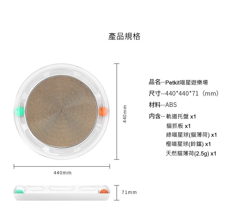 軌道托盤x1、貓抓板x1、貓薄荷球x1、鈴鐺球x1、天然貓薄荷2.5g
