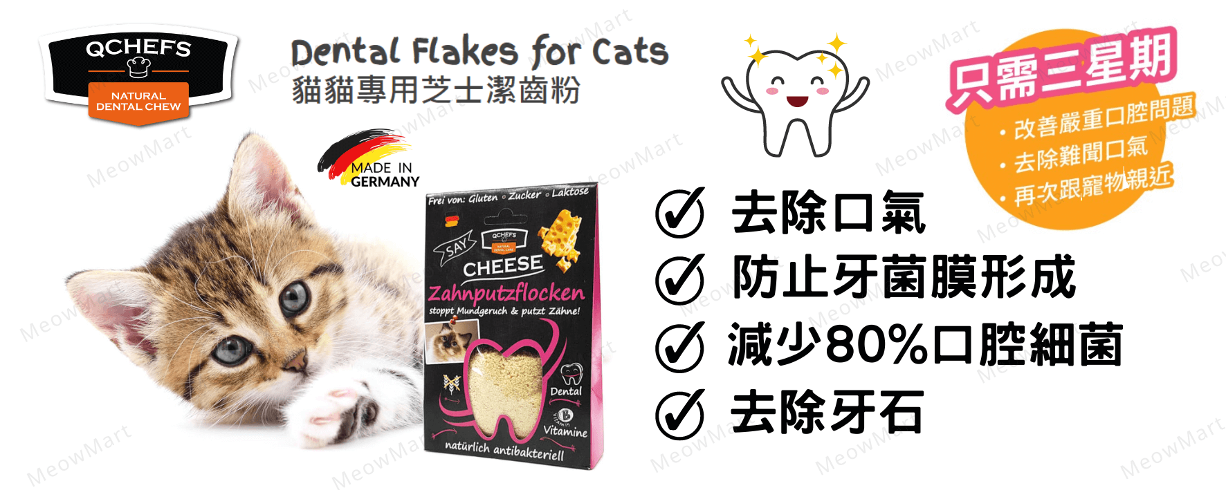 QCHEFS 是以茅屋芝士為主要成份的純天然潔齒寵物食品。而茅屋芝士當中有一種蛋白質是可以抑制口腔中的細菌生長,也可把口氣,牙菌膜,以及牙石去除。所以只需要貓貓中的口水接觸到我們的產品,這個蛋白質便會溶解出來並分佈在口腔當中,這樣便能夠進行潔齒了。