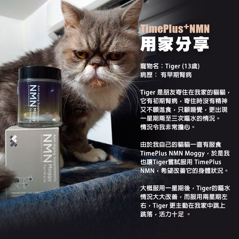 NAD+ 亦稱輔酶Ⅰ,參與動物體內細胞一半以上代謝反應,是哺乳動物體內功能最廣泛和最重要的物質之一。哺乳動物體內負責延長壽命與抑制衰老的長壽蛋白 (Sirtuins),其活性亦取決於 NAD+。寵物體內的 NAD+ 水平會隨年紀增大而急速下降,導致代謝活動開始減慢,粒線體的功能下降,令寵物身體機能出現衰老的情況。讓寵物保持年輕的狀態,關鍵是補充流失的 NAD+。