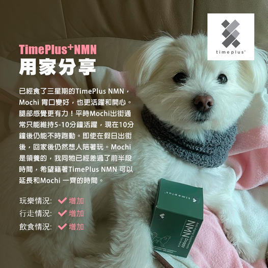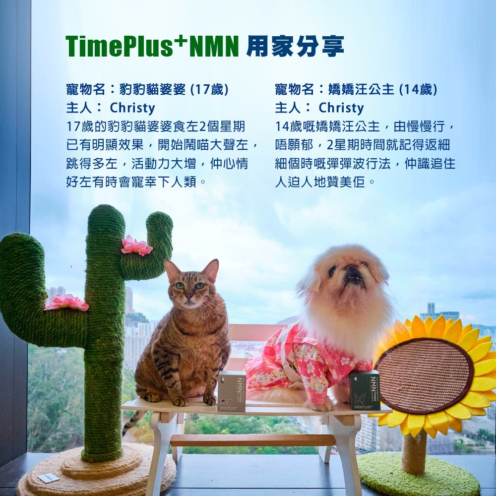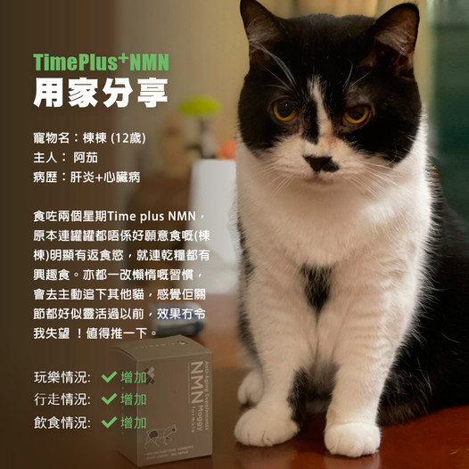 TimePlus+ NMN 是 NAD+ 最直接的前體,NMN 在食物中的含量微乎其微,因此您的寵物無法日常累積得到足夠的補充。每日補充適量 NMN,有效提升寵物體內 NAD+ 水平,抵抗衰老,使身體重回「年輕狀態」。